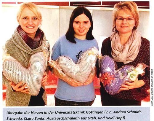 Am 25. Februar 2015 war es so weit: DIe individuell angefertigten Herzkissen konnten Frau Andrea schmidt-Schweda, Krankenschwester für Brustkrebspatientinnen am Universitätsklinikum in Göttingen, überreicht werden. Während des Treffens konnten die Jungen Damen weitere Informationen darüber erhalten, wie die Patientinnen betreut werden, und die verschiedenen Behandlungsmethoden von Brustkrebs etwas kennenlernen.