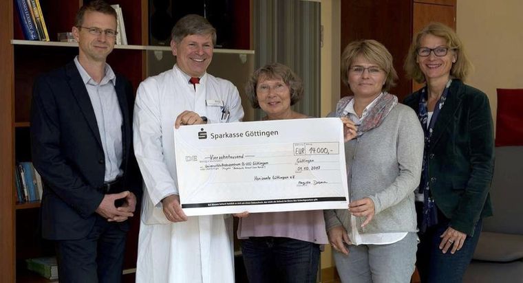 Rund 2000 große und kleine Läufer hatten im Mai die fast 14.000 Euro erlaufen. Während einer Spendenübergabe konnte das Universitäts-Krebszentrum Göttingen nun einen Scheck in Empfang nehmen. Hinzu kommen noch einmal rund 9000 Euro durch das Fundraising der UMG für die Stelle der aBCCN. „Alle Spendengelder kommen uneingeschränkt der Fortsetzung der Stelle der ambulanten Breast and Cancer Care Nurse zugute“, sagt Margitta Degener, Vorsitzende von des Vereins Horizonte, Verein zur Unterstützung brustkrebskranker Frauen. Prof. Dr. Lorenz Trümper, Direktor des Universitäts-Krebszentrum an der UMG bedankte sich bei allen Unterstützern und erklärte: „Es sind aber noch dringend weitere Spenden notwendig, um die Stelle auch längerfristig abzusichern.“